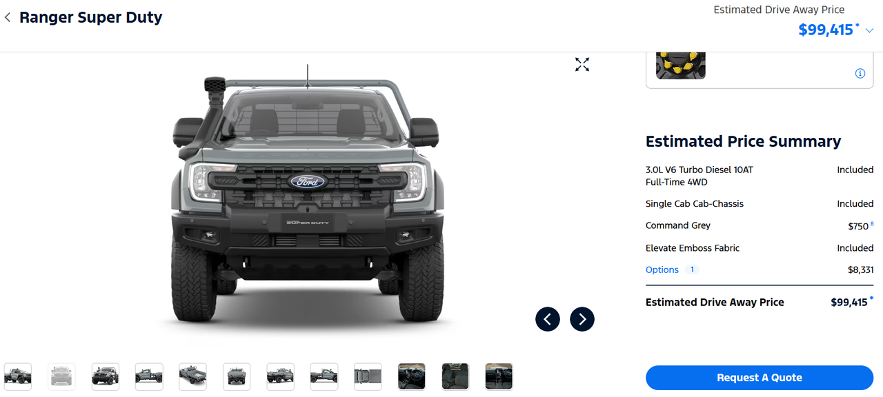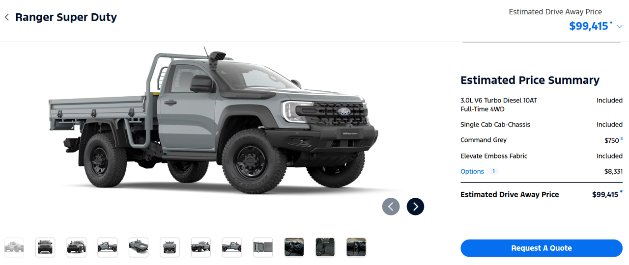 I've been offered a drive at some point in the future. Even though I have no use for the Super Duty package, I'm a gardener not a mining contractor, I'd love to have one. Make mine a single cab in Command Grey with the body-coloured tray (or have a custom one made), no bull bar, and possibly the snorkel delete. At 100k, that is never going to happen, not when a standard Ranger with the same powertrain is half the price.