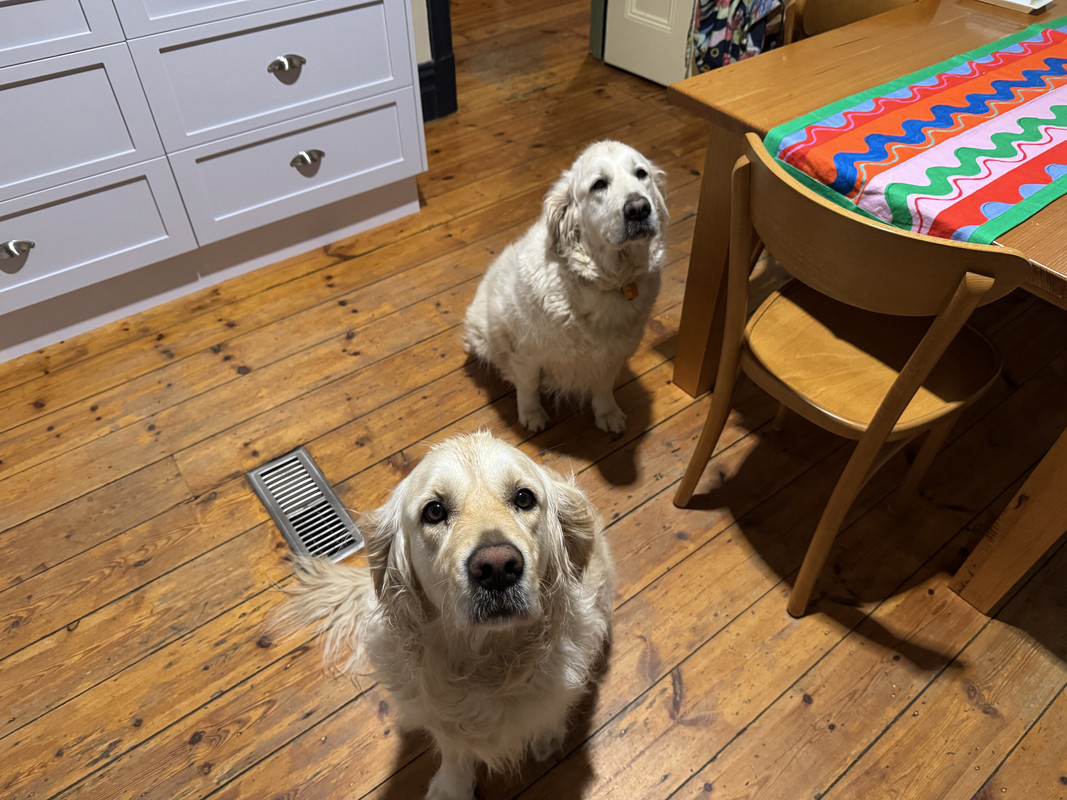 Busters ready to Rob a bankA short thunderstorm this afternoon meant bringing them inside. Buster with his thunder hat on.