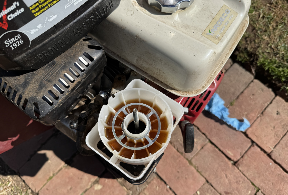 The old oil wasn't too bad, a dark gold-brown, but well worth refreshing. I refilled with Penrite Small Engine 10w30, which is semi-synthetic. From what I can see, the Honda-branded oil offered in Australia is a mineral based 10w30, although there is a synthetic 5w30 offered overseas.