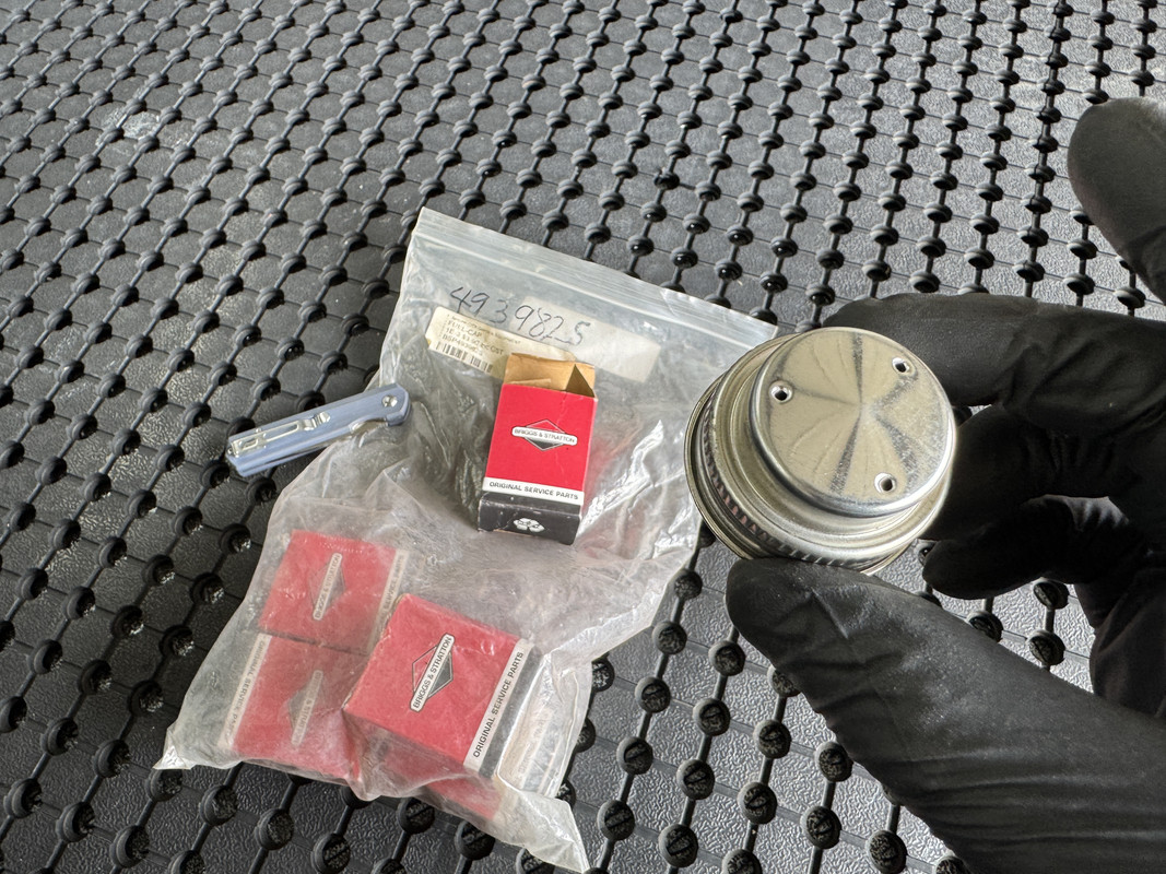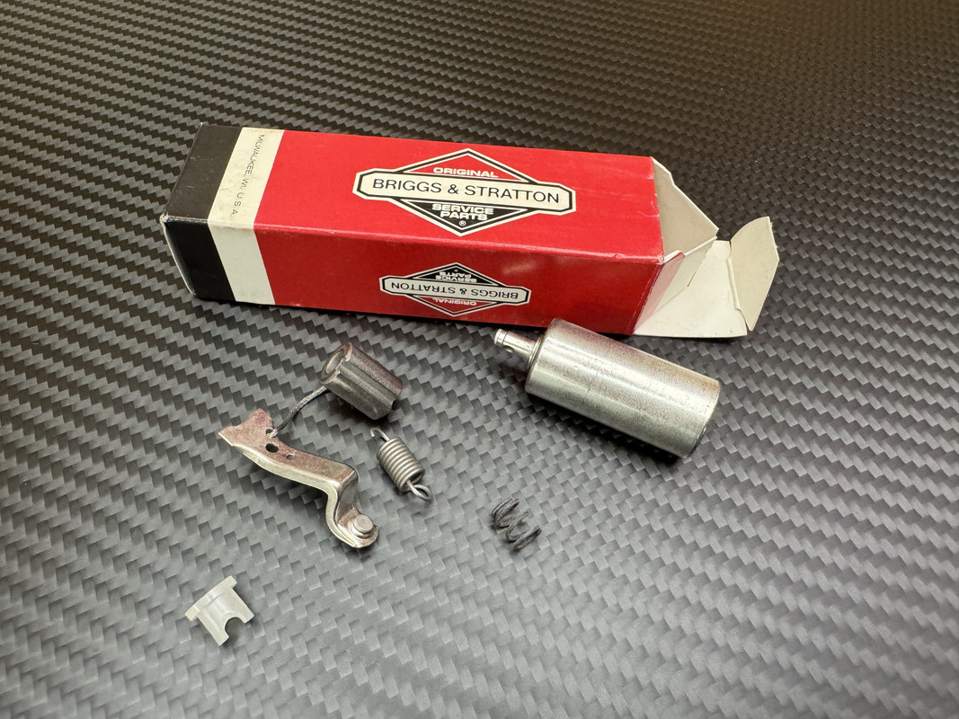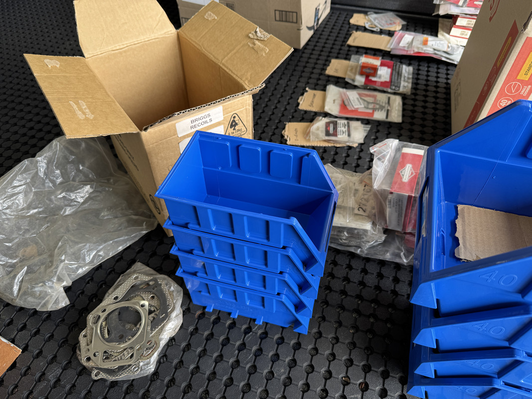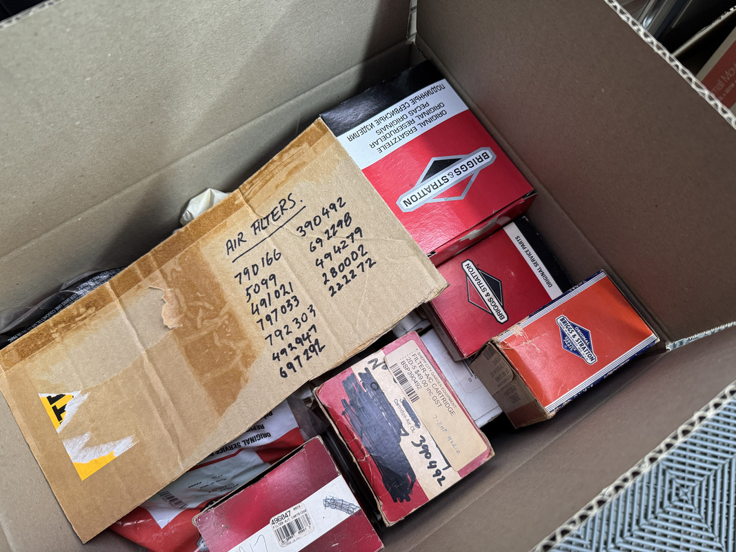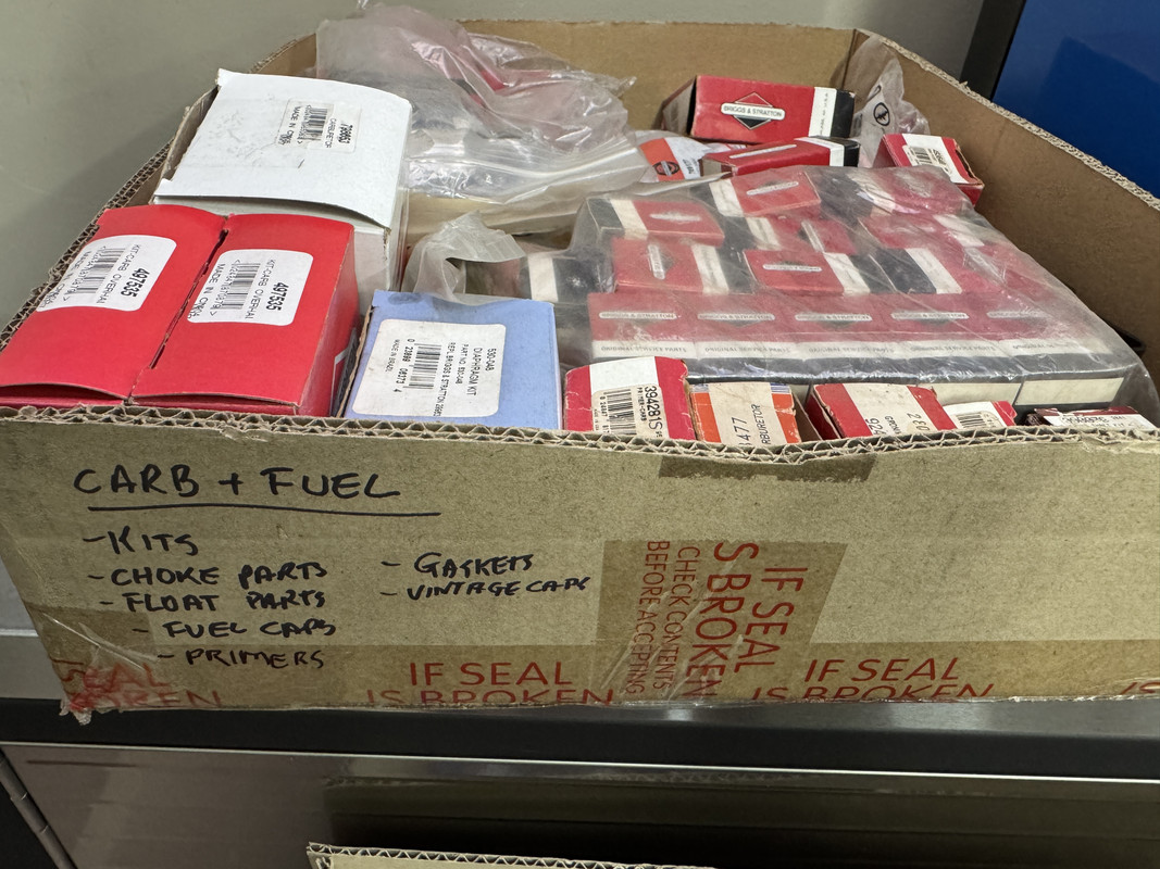 The majority of boxed parts were put into large cardboard boxes, which were labeled with a category and a list of contents. In some cases, I also wrote down part numbers. This will help when I work through each box for keep/sell process. Category groups include internal engine parts, fuel system & carb parts, electrical and dipsticks, air filters, governor springs/linkages, crankcase and engine gasket kits, starters and recoil parts, fuel tanks and wheels.
