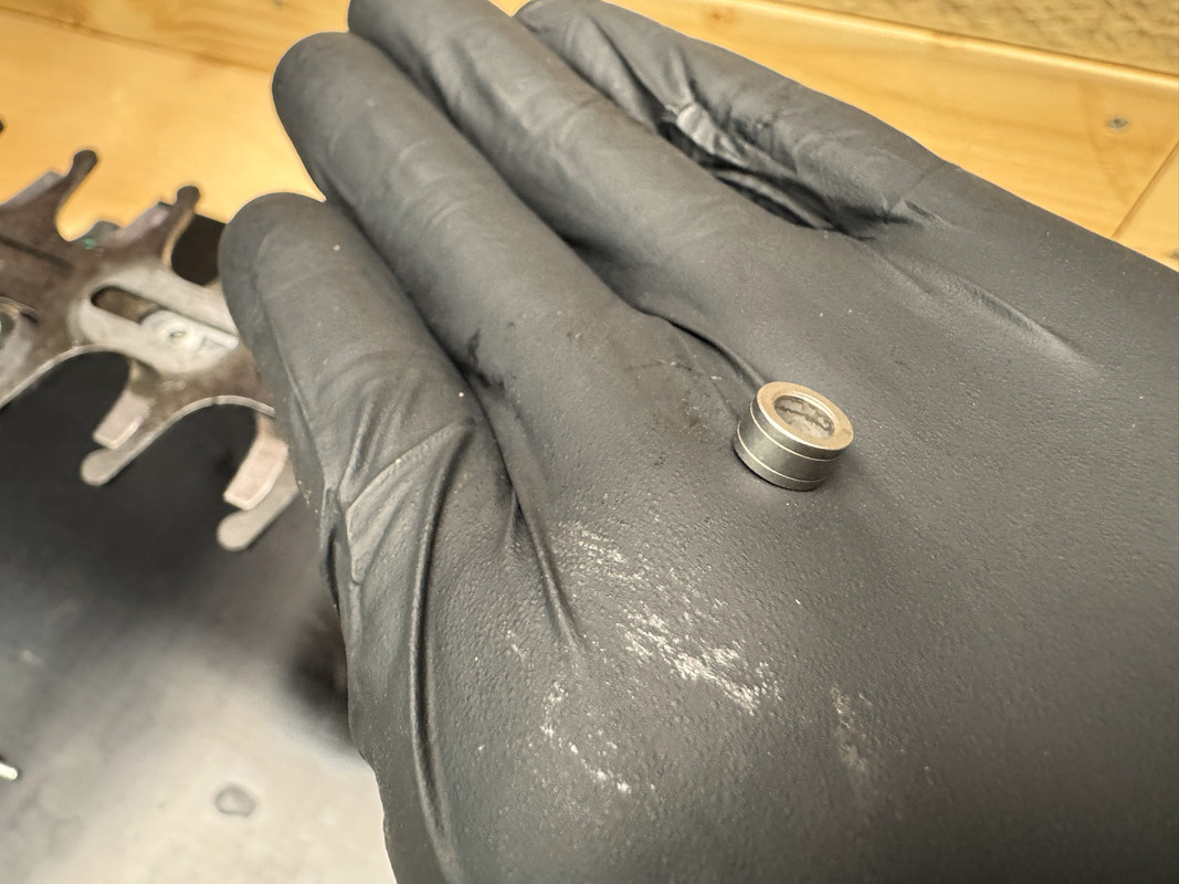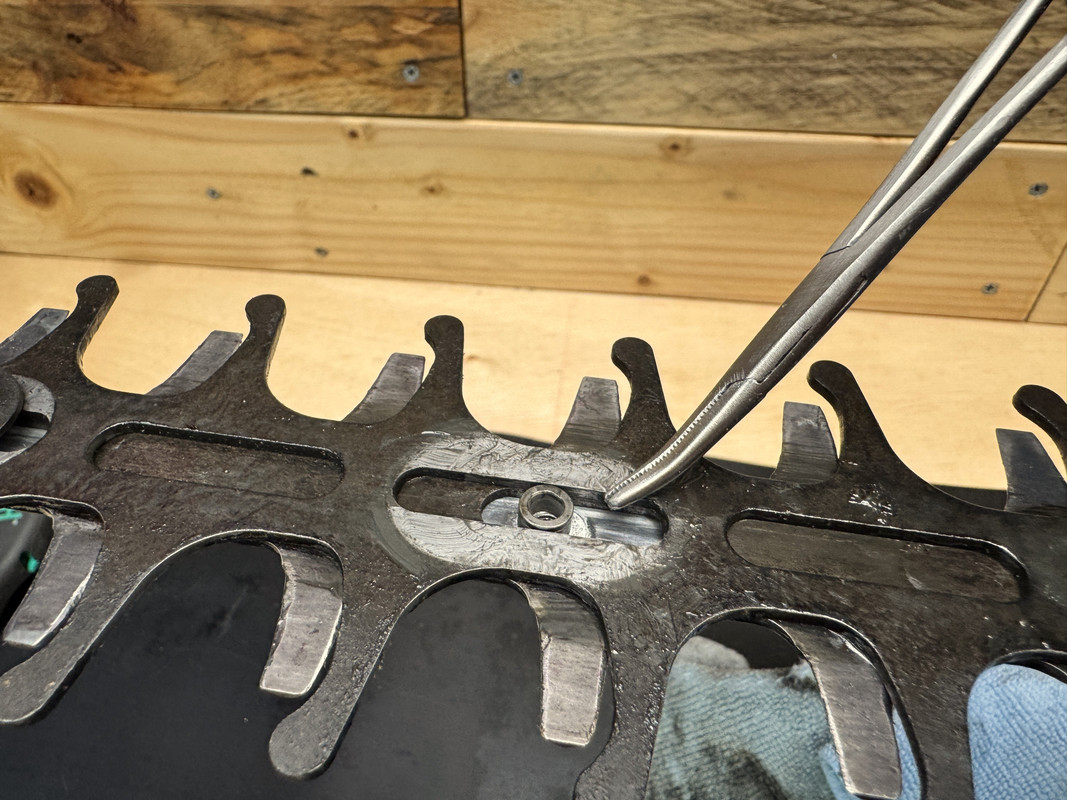 No problem, I'll find something in the parts crypt. So, off I went with the sharpening, cleaning, and re-greasing. I put it all back together and went looking for some hardware. The T27 bolt was easy, I have a case full of replacement Stihl hardware, I even found a suitable washer. But, I wasn't so lucky finding the tiny little piece that sits below the washer in the blade groove. This tiny part is crucial because it allows the fastener to be tight, yet prevents the bolt and washer clamping down too tight and locking up the blade movement.