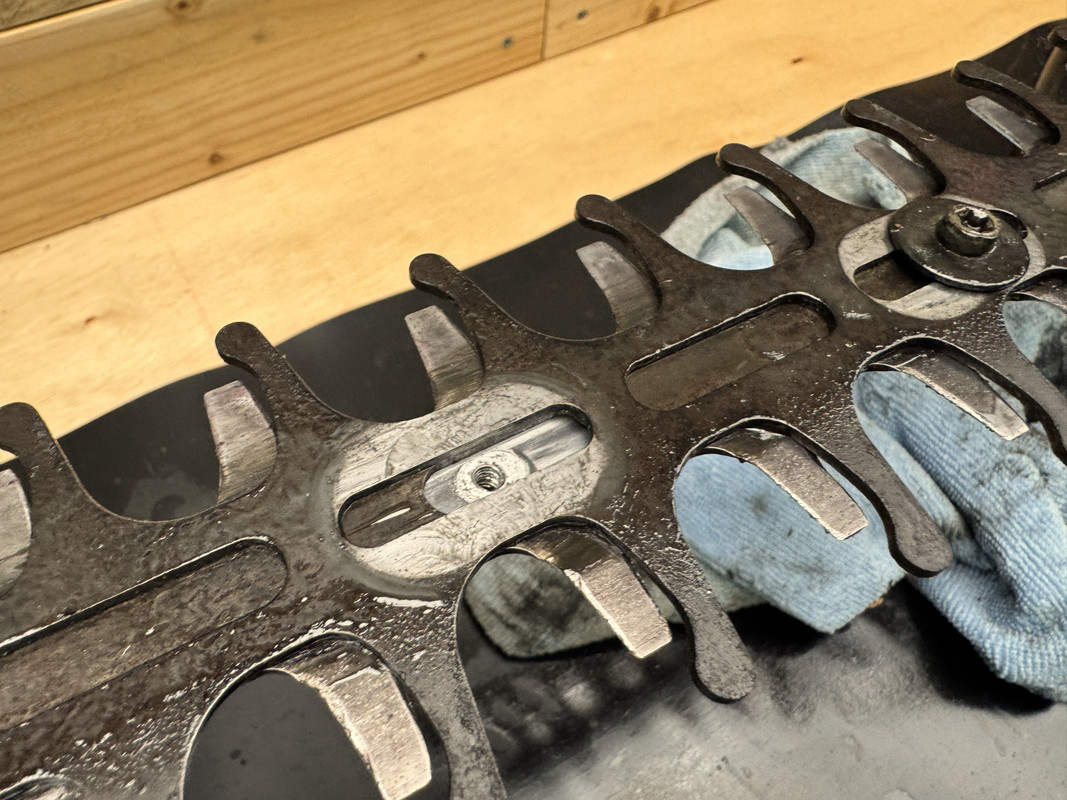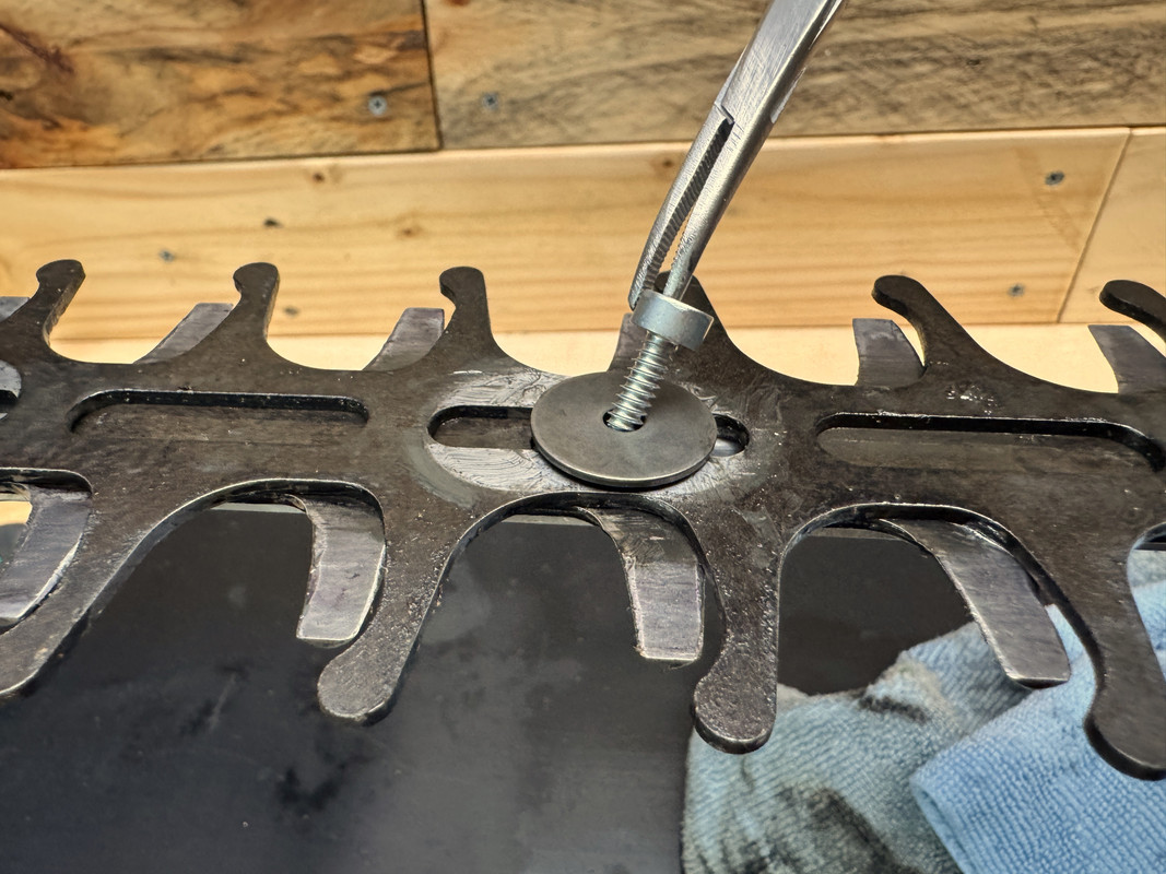 As you can see, the "slider" fits into the grove created by the two blades, the washer sits on top and the bolt drives through and into the blade support guide. This arrangement provides just enough torque to keep the blades firm for crisp cutting, but not too tight that the blades won't oscillate.