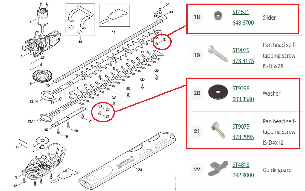 Knowing how this stuff works, and being a battery powered tool, I was certain this missing piece would mean buying a whole blade assembly, valued at around $130 - $150. I've had colleagues scrap otherwise functioning hedge trimmers because of a missing piece like this that is not available as a spare part. As a long shot, I went and found the parts manual, then landed on the required parts within 2 minutes! This availability of parts is reassuring as Stihl is now fully invested in battery tools. In the past, battery or electric powered would have meant non-serviceable.